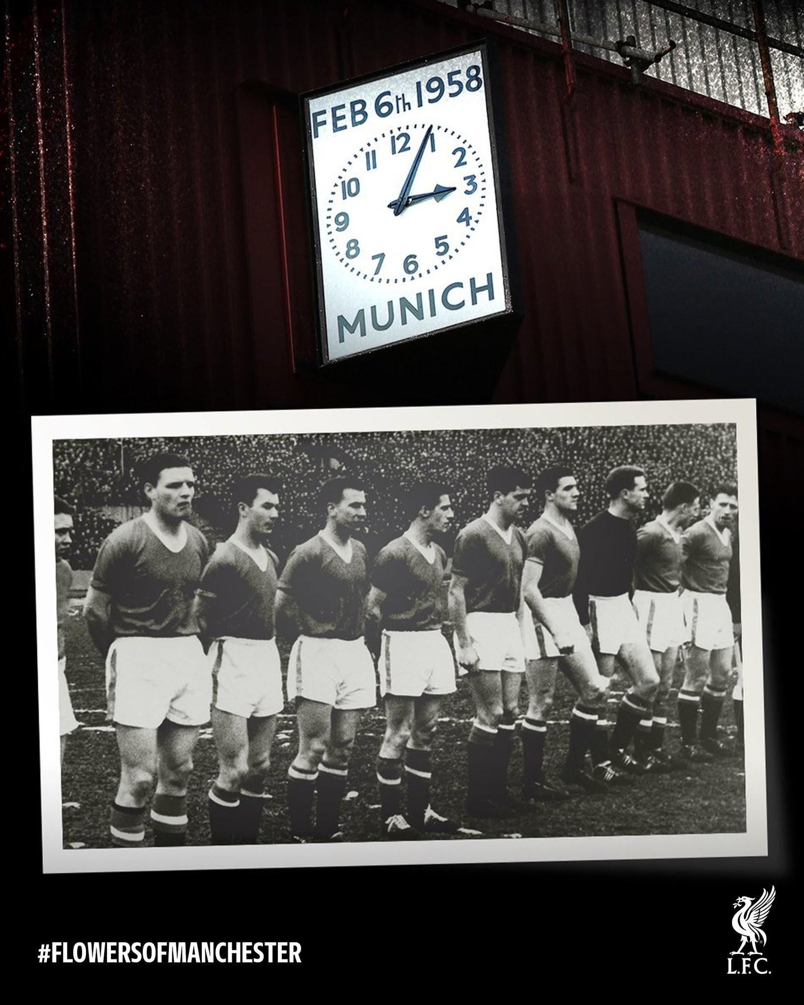 利物浦在官方声明中写道:“在慕尼黑空难纪念日到来之际,我们停下脚步,共同缅怀那场悲剧中的逝者。我们的思念与曼彻斯特联俱乐部同在。”声明还配上了象征纪念与尊重的标签#曼彻斯特之花。
